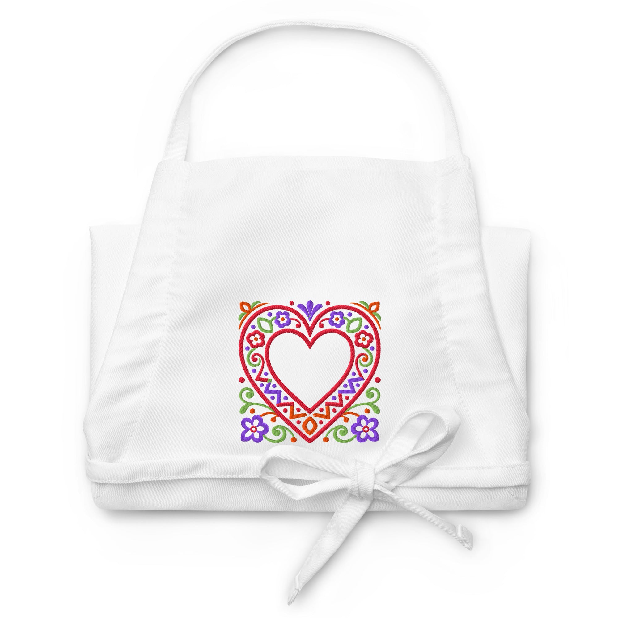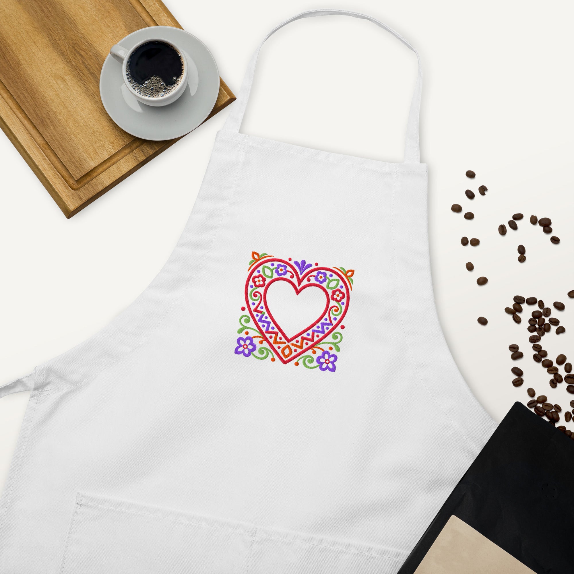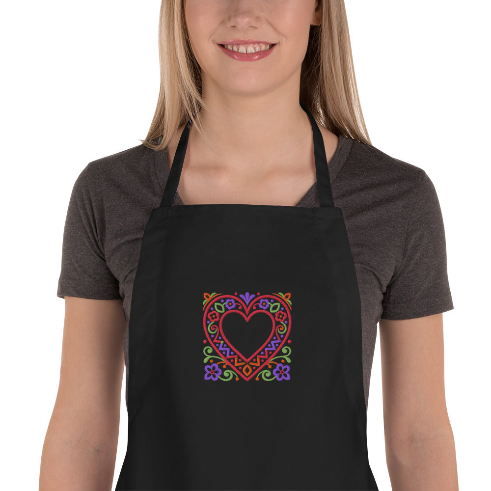 The Folk Heart™ Embroidered Kitchen Apron features a vibrant heart motif inspired by traditional folk art—symbolizing warmth, hospitality, and the love poured into every meal. The intricate embroidery pops beautifully against the black fabric, making this apron as expressive as it is practical.